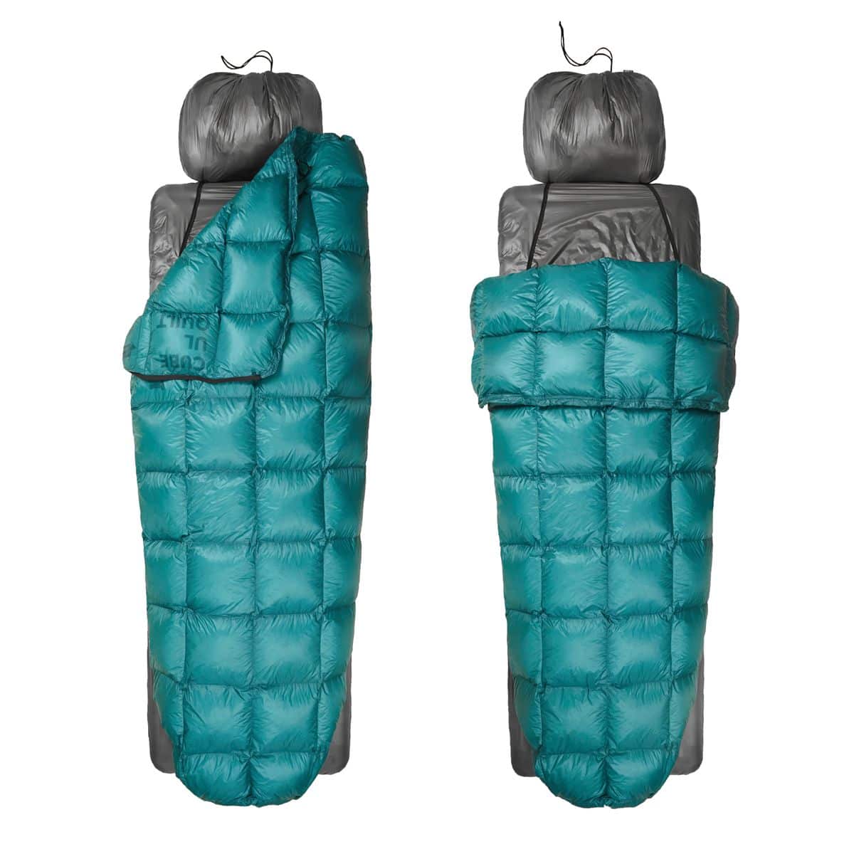 The Cube UL Quilt is designed for summer adventures and camping when you need to sleep as comfortably as at home. It is a quilt and a sheet for a mat that are zipped together to make a spacious and comfortable sleeping system. It has everything you would have in your own bed: a sheet, a blanket, and a pillow. The updated sheet has a larger pillow compartment, a lighter weight, and color coding for easy reference.