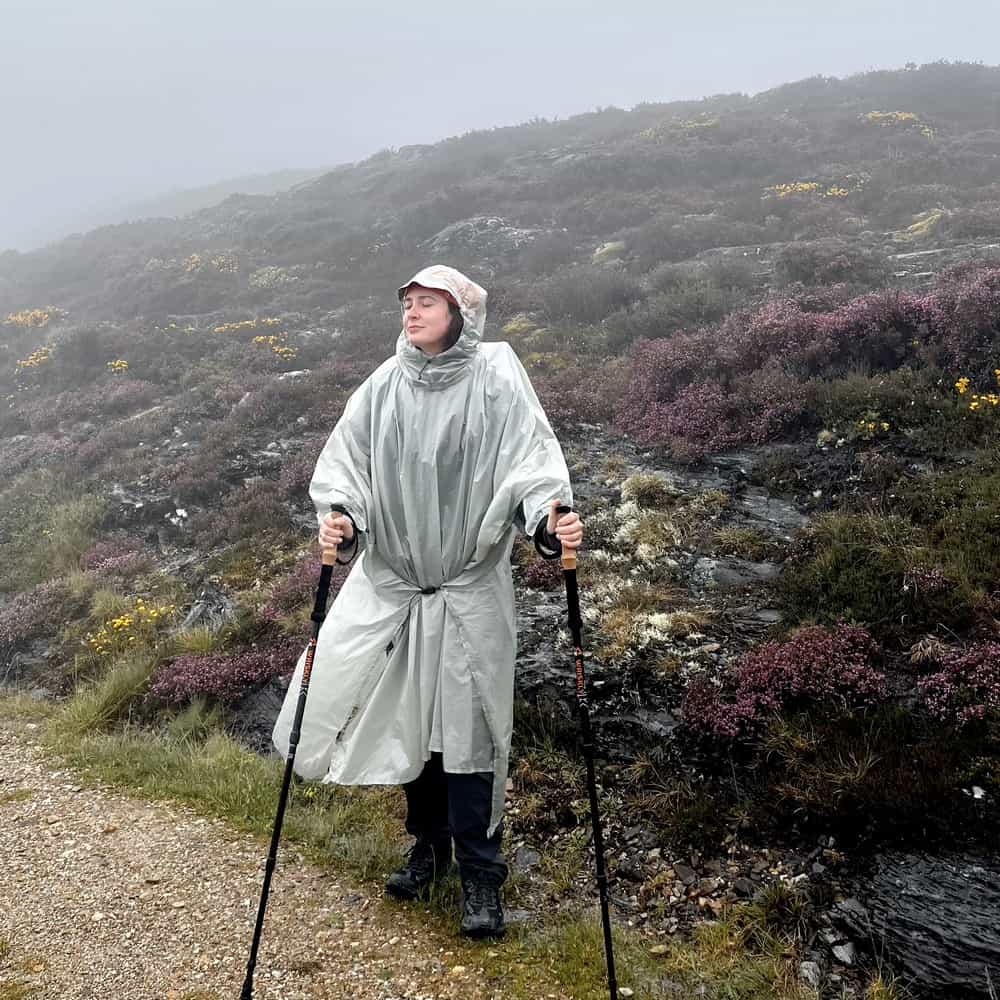 The size M is 211g inside its sack wich can be easily compacted to 6x15cm (9x15stated), there are lighter ponchos but they’re shorter in length and wide so you end up wet on your forearms and legs also those can’t be set as a tarp, and anyway you could easily cut it down and sew the borders so to make it lighter. This one even has an ellastic and adjustable string to get it tight around the waist. Seams come already taped, I like its perceived quality and I’m very sure it’s up to what it’s got to do