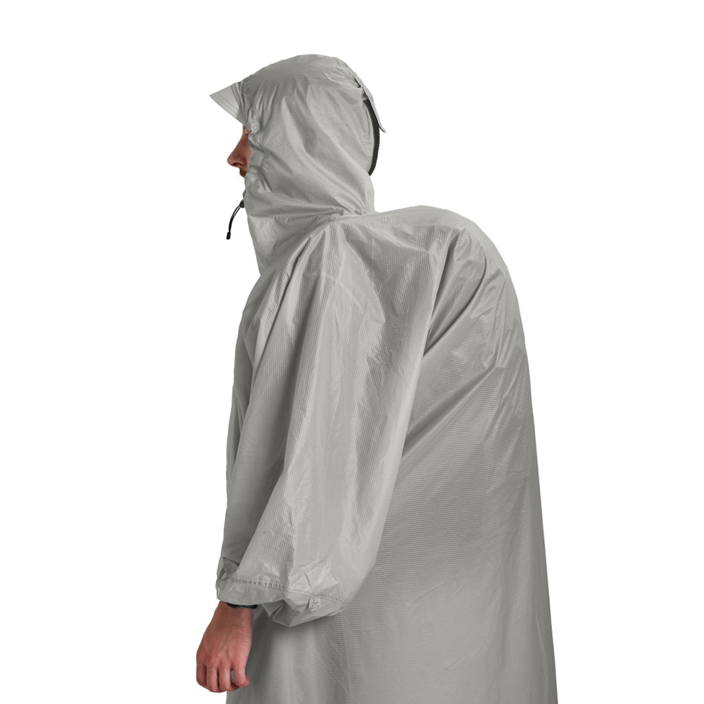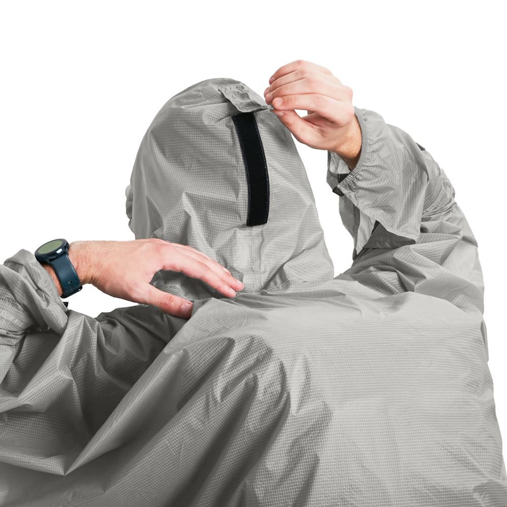 Lightweight and packable poncho-tarp. It features a well-adjustable hood, wide visor and buckle fixation on the front, which provides better wind protection.