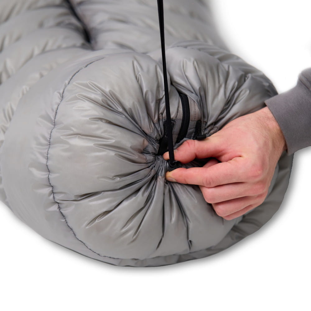 Top opening tightens with drawcord + cord lock and wraps around neck like warm down collar. Zipper area insulated with draft tubes, so you can roll around without worrying about twisting or drafts. Need ventilation? Loosen foot-end drawcord or unzip left or right zipper.