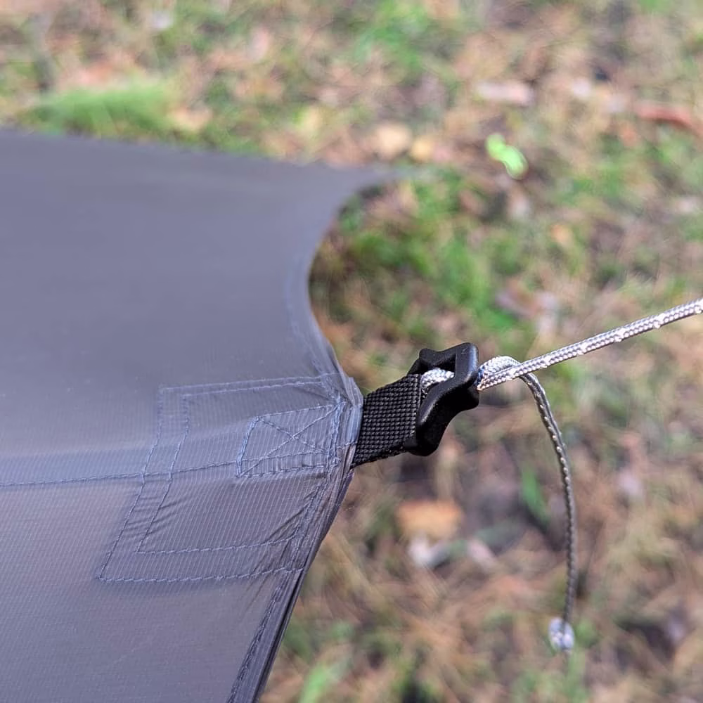 There are 8 attachment points with linelocks and guylines along the perimeter. An additional loop on the center seam allows you to create a three-sides protected shelter. Length from the center seam loop to the bottom is 75 cm (29.5 in).
