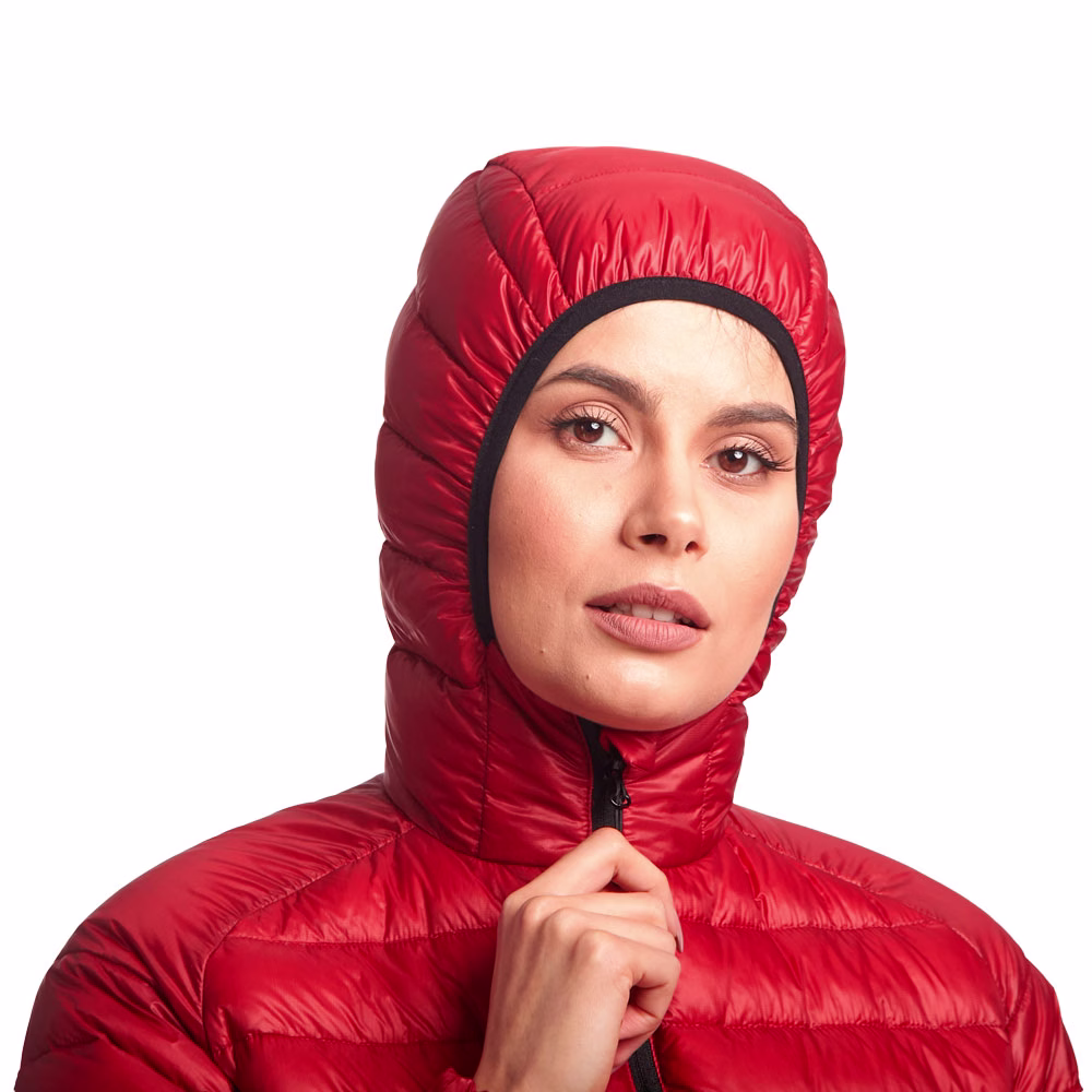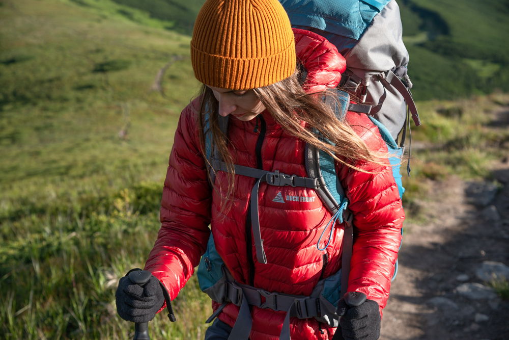 The jacket’s athletic cut, elongated sleeves, and back give you movement freedom and comfort during any activity. The anatomical hood fits the head and face well and provides reliable wind protection. The shoulders have special synthetic insulation inserts. They prevent the down from migrating and creating cold spots when you wear a backpack.