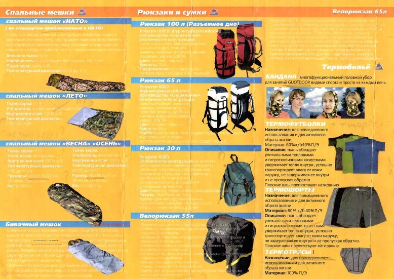 In 1999, a line of tourist products called ROCK FRONT was launched. Under this brand, the company began manufacturing tourist backpacks, sleeping bags, thermal underwear, and bicycle bags. At that time, they began working with advanced materials such as Hydrocoat membrane fabrics and VelaFlex insulation.